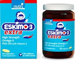 Eskimo®-3 Extra is a pure and stable omega-3 fish oil providing high levels of fatty acids EPA and DHA in their optimal 3:2 ratio. Each capsule typically provides 300mg of EPA and 200mg of DHA. Omega-3 fatty acids have been well studied, with EPA and DHA contributing to the normal function of the heart, and DHA supporting normal brain function and vision.